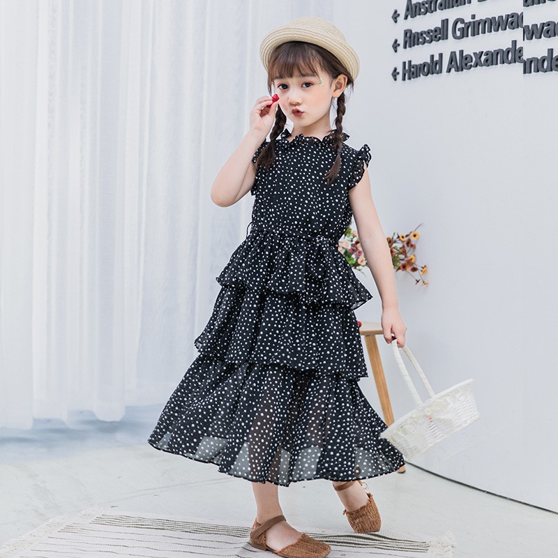 Girl S Chiffon Dress Elegant Vintage Polka Dot Sleeveless Layered Ruffle Hem Midi Dress High Neck Tiered Long Beach Sundress Kids Skirt Children Clothing For 6 14y Shopee Malaysia